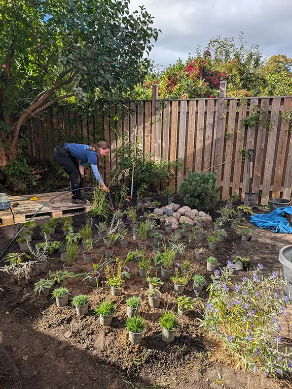 I den solstänkta delen av trädgården placeras den vackra långsamväxande och lågväxande tallen ’Watereri’ med sina blågröna barr och framför den ett litet stenröse. Framför breder sig en härlig torktålig perennrabatt ut sig likt en äng. Jag kallar det perennhav eller perennäng. Här planteras perennerna med tanke om att vara så naturlik som möjligt som om det skulle kunna vara en äng. Vi kallar det den vilda estetiken planerat men ändå inte. Här finns röllika 'Coronation Gold', pärleternell, strandtrift, silvermalört, rödklint, liten blåklocka, fjädernejlika 'Frösön', läkerudbeckia, gulltörel, martorn 'Big Blue', kärleksört 'Thunderhead', grekisk vädd 'Mars Midget', purpurmejram,