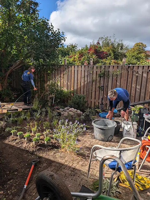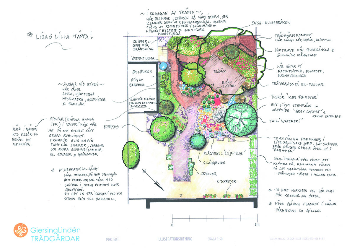 Efter vårt möte tar jag tåget hem och under resan skriver jag ner Lisas önskemål och tankar och mina funderingar. Väl på kontoret börjar mitt jobb. Jag skissar, letar inspiration, prövar olika lösningar i av trädgårdens struktur. Hur gör man för att få den lilla trädgården kännas större och utnyttjas bättre och vilken växtlighet är rätt för trädgården utifrån jordmån och ljus. Jag landar i att dela upp trädgården i två partier den skuggiga lite fuktiga under trädet och den soliga och torrare nära huset och den befintliga uteplatsen.
